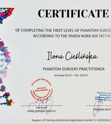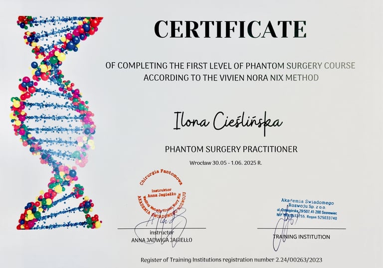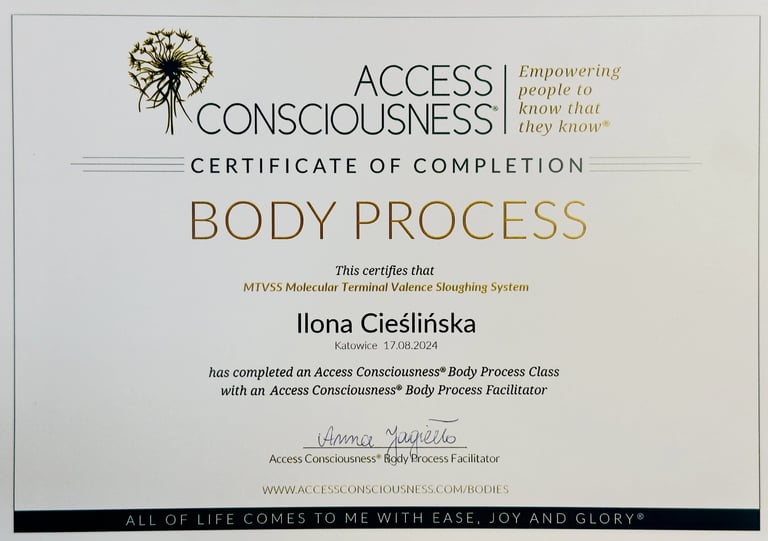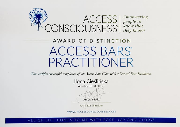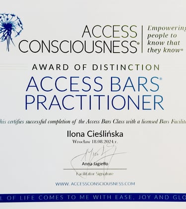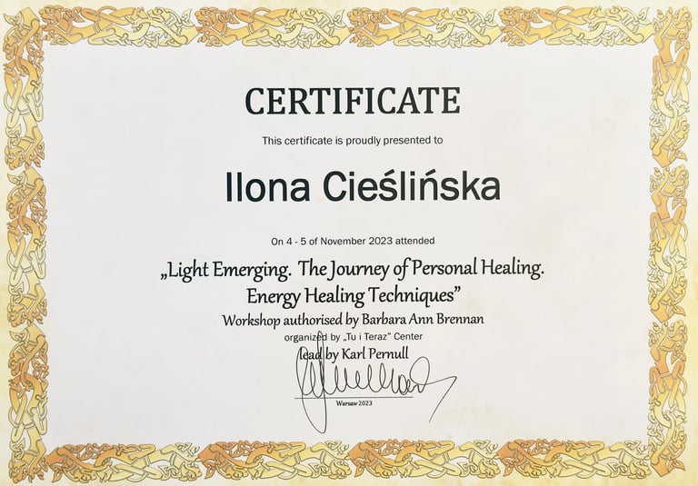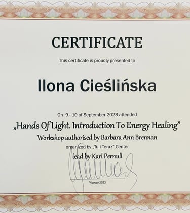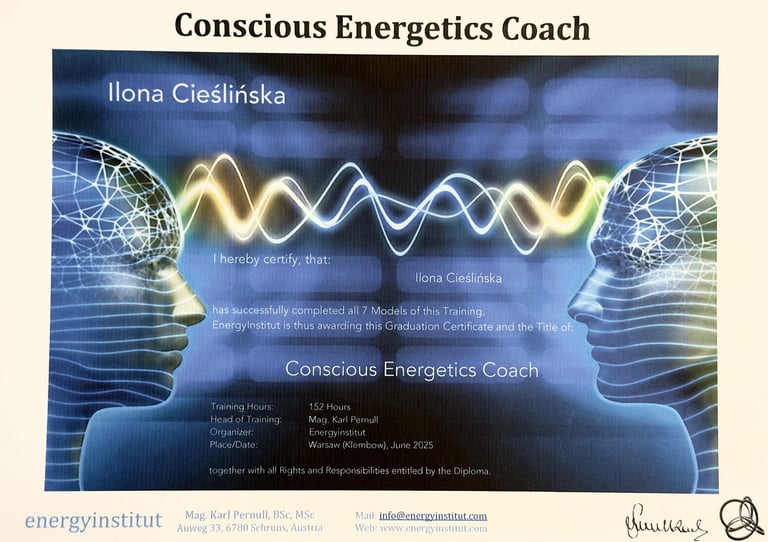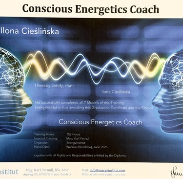 Po dwóch latach intensywnej nauki i praktyki z własnym polem energetycznym oraz uzyskaniu dyplomu ENERGY INSTITUT Naturheli Praxis Karl Pernul, rozpoczęłam nową, fascynującą drogę w procesach kwantowych jako Conscious Energy Coach. To kierunek oparty na autoryzowanym programie szkoleniowym Barbary Ann Brennan.